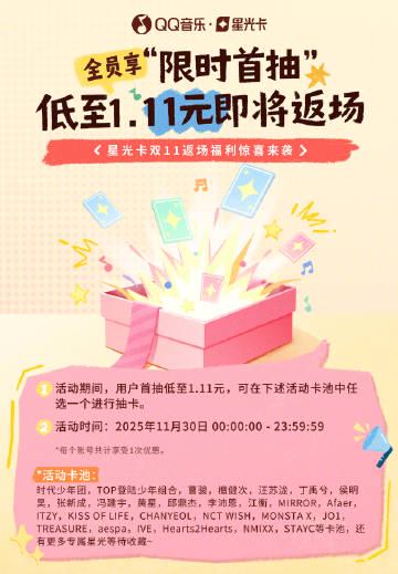 昨晚刷朋友圈时,看到国内表妹连发了三条尖叫动态——配图是QQ音乐星光卡的抽卡界面,最上面一行小字写着「首抽1.11元」。她激动地跟我说:「姐!时代少年团新卡面绝了!你快去抽啊!」